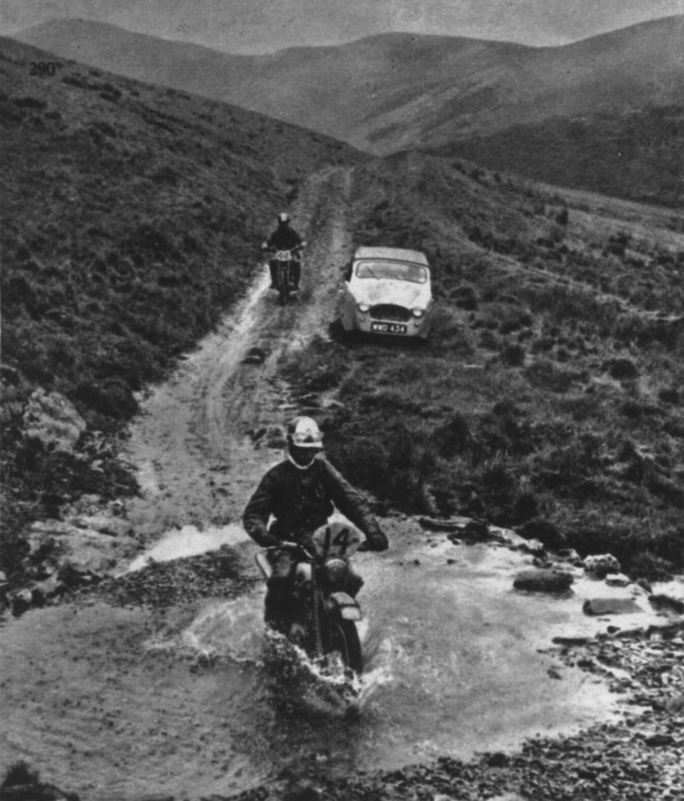 Photo – Written wherever Motorcycles are ridden: Services Cup winner #44 Sgt D ‘Bill’ Booker (500 BSA) follows outright victor #14 Cfn. Pat Brittain (250 Greeves) past “Motor Cycling’s” staff Reliant on the Esgair Gelli to Ffair Rhos section WTDT 1958