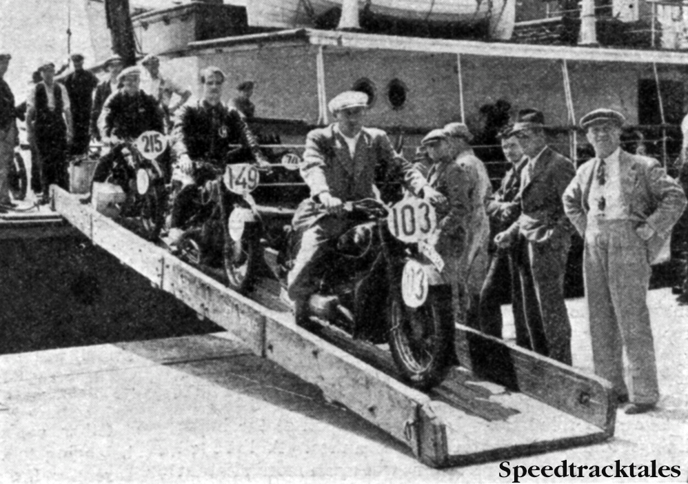Photo – The German’s have arrived! three of the German Contingent for the International Six Days Trial landing at Southampton last week. The two leading machines are BMWs and the third on the gang plank is a Zundapp. On the exterme right is a popular ‘International’ figure – the interpreter. ISDT 1937 (Speedtracktales collection)