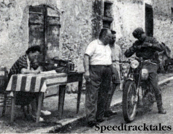 Photo- Stamp control shot of Stocker (499 Royal Enfield) in the 1948 ISDT at San Remo in Italy. On that occaision he was a member of the winning British Silver Vase team