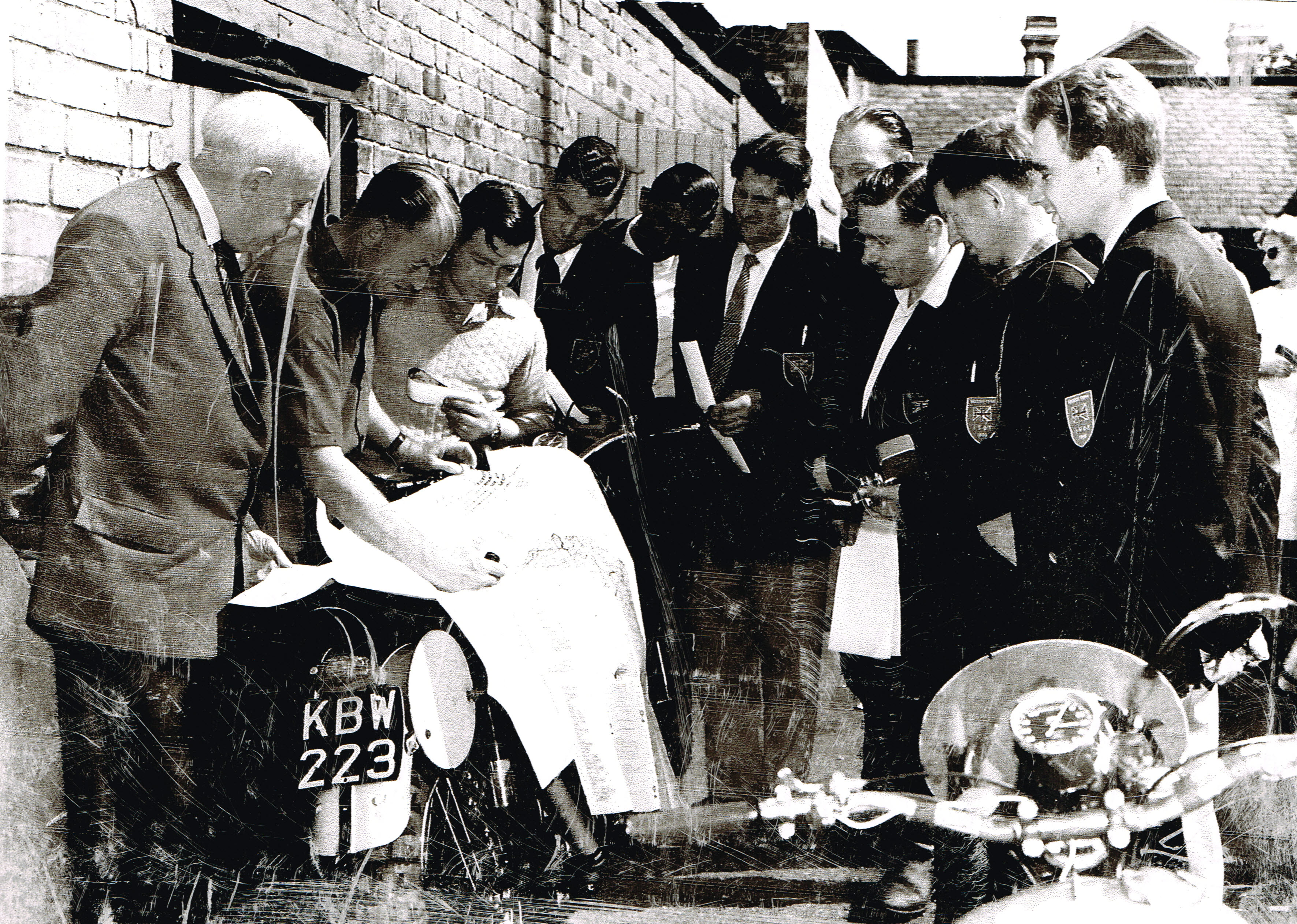 Photo – British team checking over the paper work ISDT 1959 (Colin Moram collection)