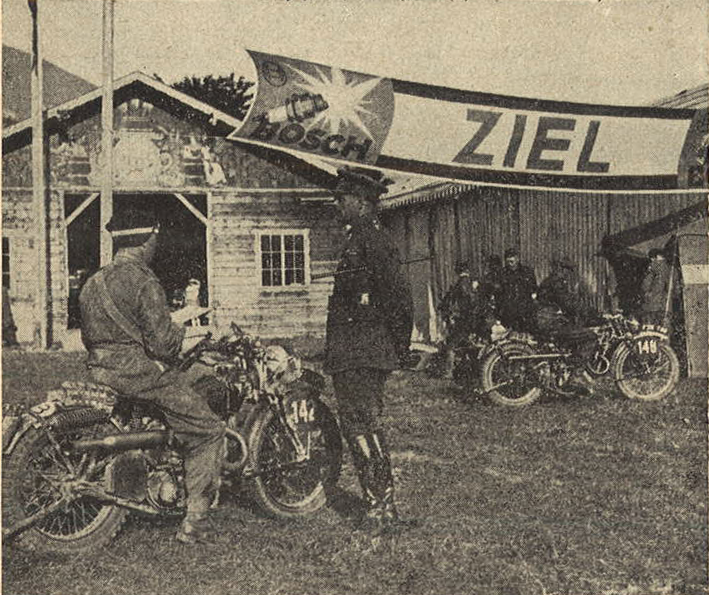 At the end of the day, which had been very hot, there was a “heavenly” shower, which again brought the riders some trouble, as the roads did get wet and slippery. As it could be expected, there were numerous losses, and especially it did strike the outfits. The English did loose a number of good men, and amongst them was also the good solo rider Tiffen jr., who doesn’t miss any ISDT. Unfortunately, also Drax from Munich, the man from the sports outfitter, could be found on the “list of losses”. He had not been able to avoid a vehicle in the opposing traffic, and went through the hedges and down a slope with his outfit. Thank god, his injuries haven’t been too severe.