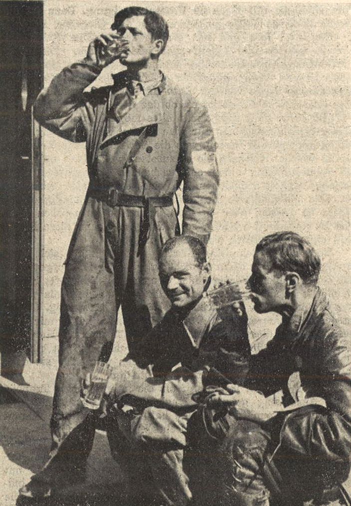 Photo It had been quite hot during the six days trial. Here one can see three thirsty souls as they refill some liquid. The tall one, standing at the outside, is the Swede Hedelin, sitting in the middle is Pierre van Maldeghem, president of the Belgian motorcycle association, and on the right hand side, our [Motorrad magazines] employee Heinz Hahmeyer. ISDT 1939 (das Motorrad)