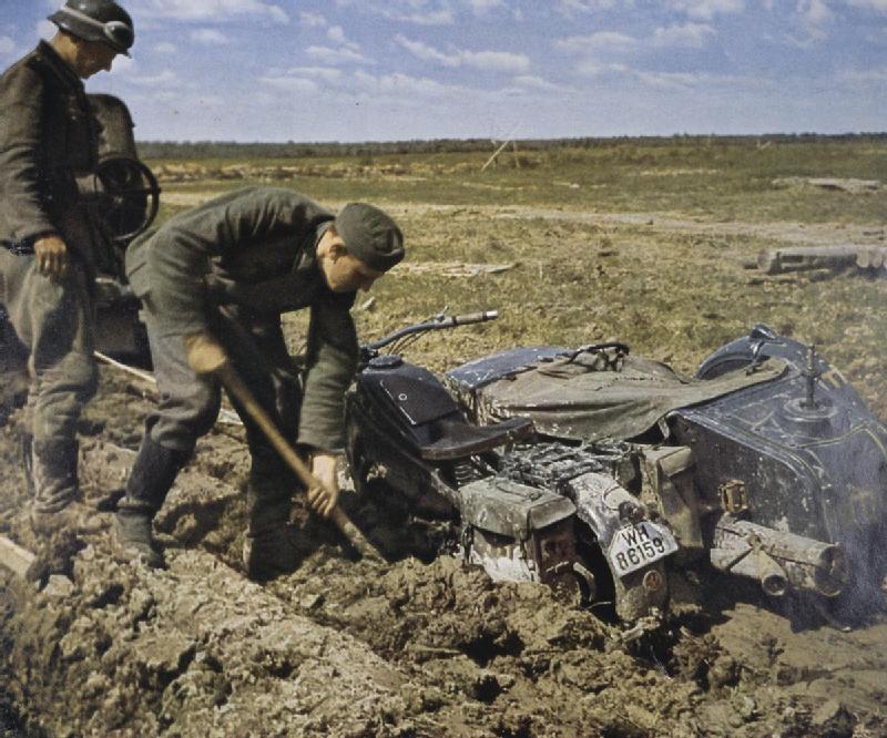 Photo – German despatch riders dig out their Zundapp motorbike which is bogged down in mud on the Eastern Front probably during the Spring thaw. (Image courtesy Imperial War Museum)