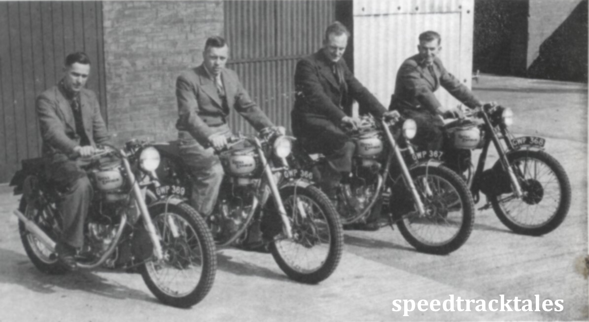 photo – Royal Enfield riders in the 1948 event. Left to right Charlie Rogers [GWP 369] and Vic Brittain [GWP 366] (Trophy Team members) Tom Ellis [GWP 367] (reserve) and Jack Stocker [GWP 368] (Vase A team) ISDT 1948 (Speedtracktales collection)