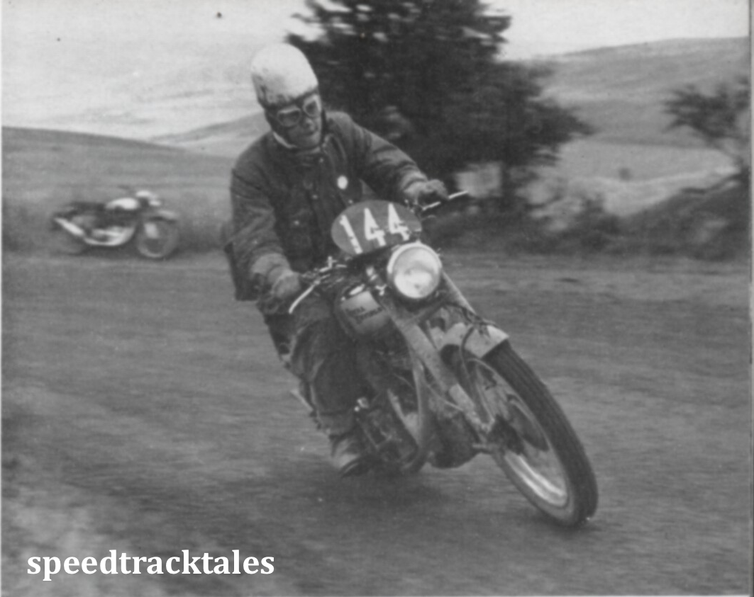 photo – #144 JV Brittain cornering at speed during the final speed test at Eppynt. ISDT 1950 (Speedtracktales collection)