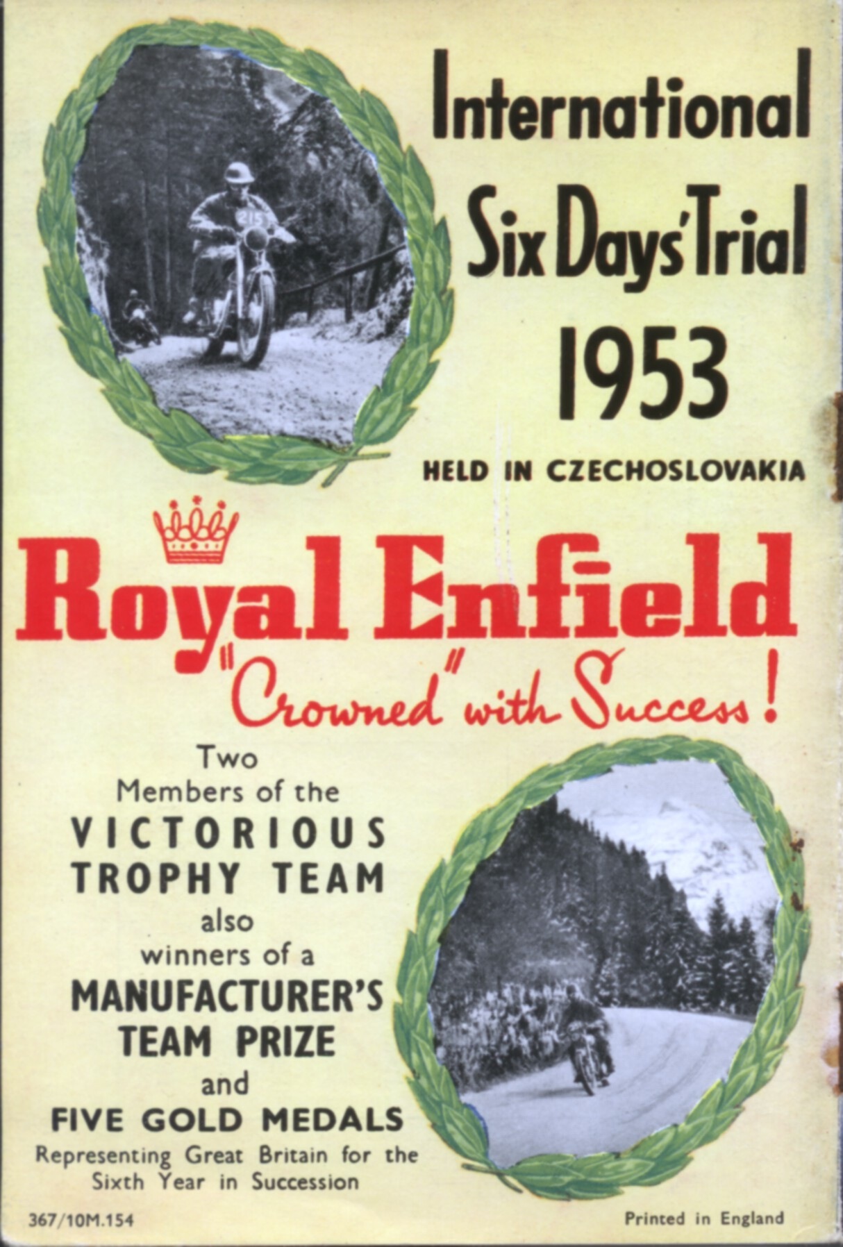 “The story of the Royal Enfield in the International Six Days Trial 1948, 1949,1950, 1951, 1952, 1953” is the title of a palm of a hand sized original publication produced by Royal Enfield in 1953 that recently fell into our hands and is of such great interest we reproduce it here. Royal Enfield, who could boast not only great bikes but a factory team that contained some of the sports greatest factory riders of the time including Vic and Johnny Brittain as well as Jack Stocker show how their successful domination of the results sheet at the ISDT meant the commute to work was going to be a lot more successful on a Royal Enfield than it might be on a lesser qualified motor cycle.