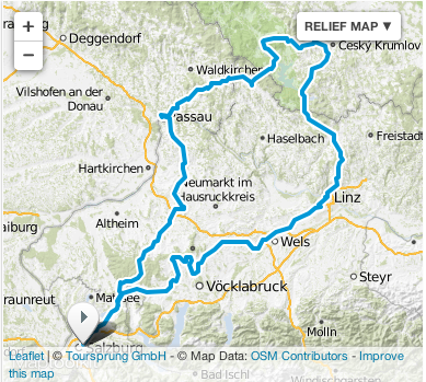 Route Day 1 •Salzburg – Henndorf – Neumarkt – •Straßwalchen – Friedburg 1 – Lohnsburg – Ried – •Andrichsfurt – Thaiskirchen – Andorf – Münzkirchen – Katling – •Haibach – Passau – Thyrnau – Sonnen – •Breitenberg – Ulrichsburg – •Sonnberg (Schönberg) – Oberplan (Horni Plana,CZ) – Ogfolderhaid – Hörwitzl – •Pöttschmüle (Vetrini,CZ) (lunch) – Kirschschlag (Svetlik,CZ) – Friedberg (Frymburk, CZ) – Weipenbach – •Leofelden – Reichenau – Altenberg – •Dornach – Linz – Marchtrenk – •Wels – Offenhausen – Wolfsegg – Ottnang – •Ungenach – Ampflwang – •Vöklamarkt – Frankenmarkt – Straßwalchen – •Salzburg
