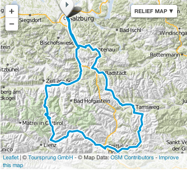Route Day 3- •Salzburg – Hallein – •St Johann im Pongau – Werfen – Taxenback – Bruch •Fusch – Ferleitern •Fuscher Törl – Großglockner – Heiligenblut – Winklern – •Stall – Flattach – Kolbnitz – Möllbrücke – Spittal – •Millstatt (lunch) – Radenthein – Weidweg – •Turracher Höhe – Turrach – Predlitz – Tamsweg •Mauterndorf – Tweng – Obertauern – Radstadt – •Niedernfritz – •Golling an der Salzach – •Salzburg