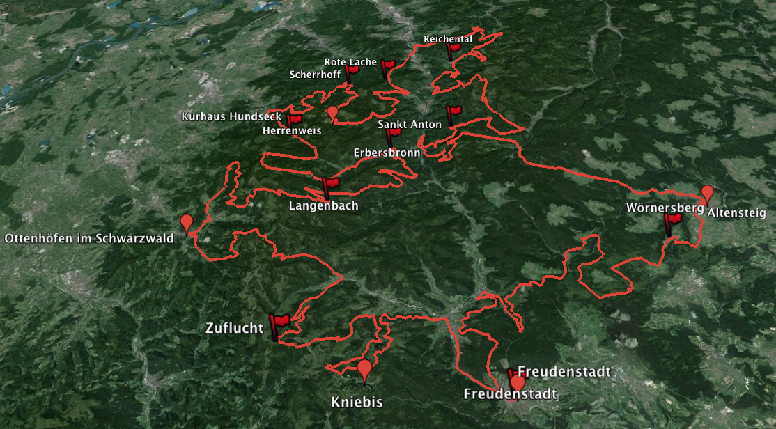 •Freudenstadt – Baiersbronn – Kalberbronn – •Wörnersberg – Altensteig – Lengenloch – Funfbronn – •Sankt Anton – Hohlahsee •Reichental – Lautenbach – Hilpertsau – •Rot Lache – Bermersbach – Herrenweis – •Scherrhof – Plattig – Langenberg – •Kurhaus Hundseck (Lunch) – •Erbersbronn – •Himt Langenbach – Kurhaus Breite Brunnen •Ottenhöfen – Ruhstein – Oberlas – •Zuflucht (Rossbühl) – Kneibis – Baiersbronn – •Freudenstadt