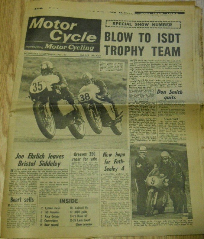 The same eBay seller also has this copy of ‘Motor Cycle‘ on sale for the 16th September 1967 which has the headline “Blow to ISDT Trophy Team”.