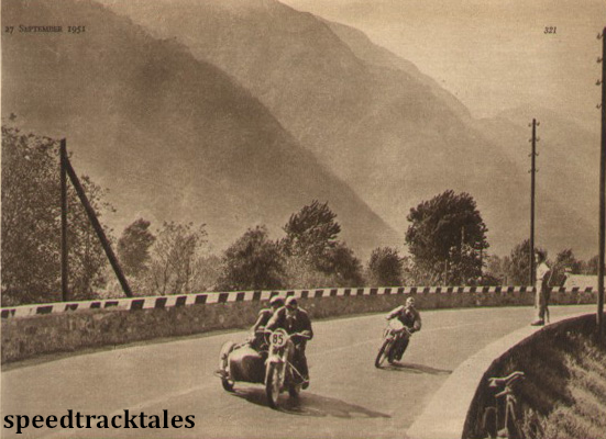 Photo – Majestic scenery at Piedmuler: S Mazzola (CZ) leads N. Biasci (Vespa) and D.Mazzancini (Vespa) ISDT 1951 (speedtracktales archive)