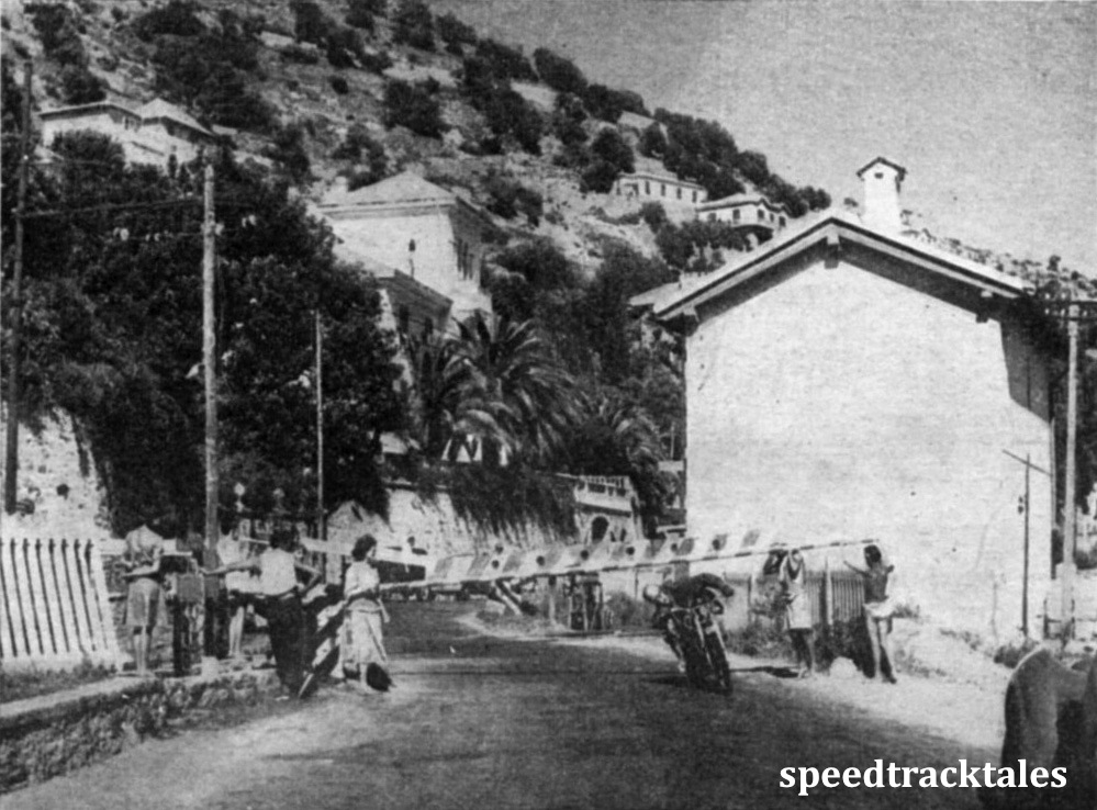 photo – A Crash-hatted competitor ducks under the barrier at a level-crossing on the main Genoa railway line. Competitors are helped in this way while ordinary traffic was held up. ISDT 1948 (Speedtracktales Collection)