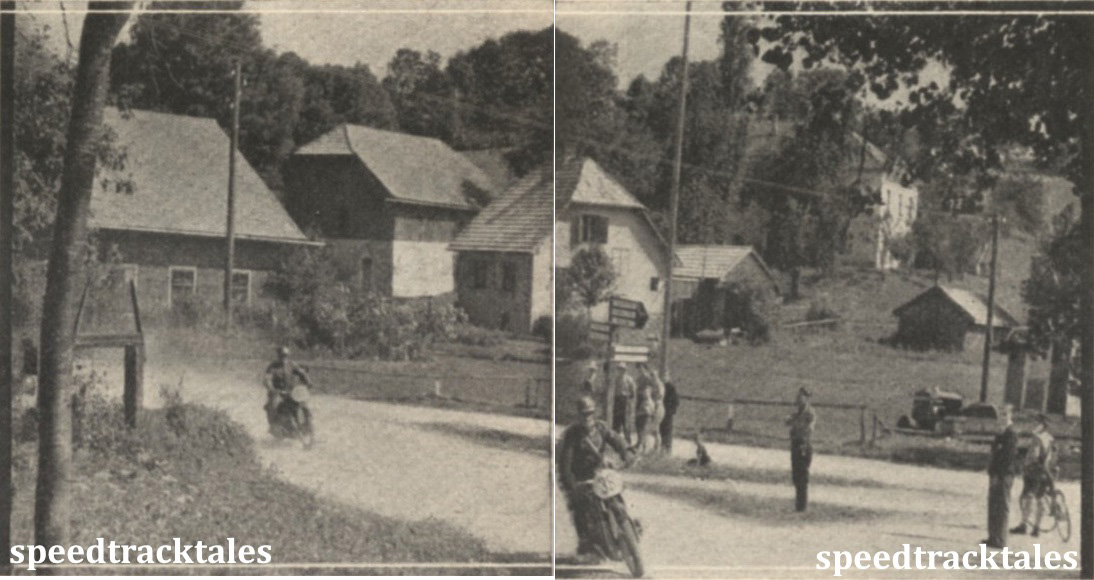 Photo – At almost every corner throughout the trial there were NSKK men on point duty. The riders are H Lodermeier and H luber (494cc B.M.W.s) Note the dust, which was such a feature of the trial. ISDT 1939 (Speedtracktales Collection)