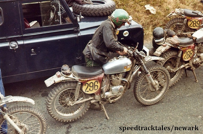 Photo – Gold medal winner #296 Mick Andrews and Cheney Triumph and the bikes of #288 Malcolm Rathmell who fettles on his bike and #289 Arthur Browning ISDT 1971 (Newark Collection)