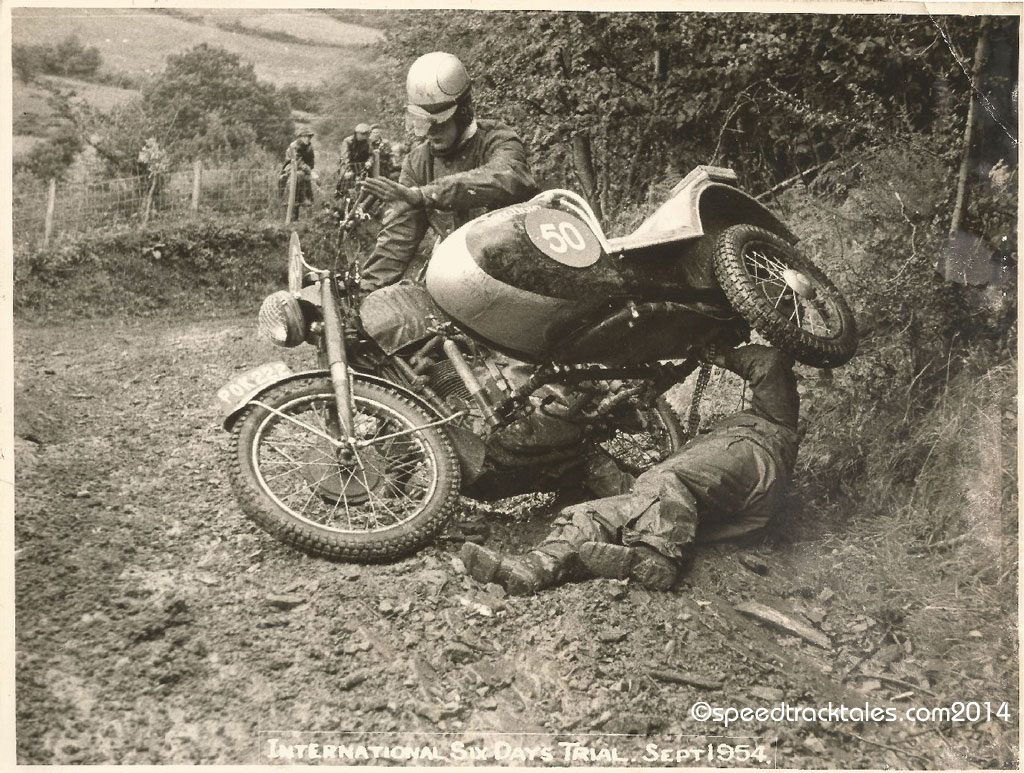 Photo – #50 WT Howard on the works entered BSA 350cc Sidecar outfit in Llandrindod Wells ISDT 1954 – (speedtracktales collection)
