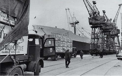 Photo of a dockside scene 1950 A freight ship called Coventry City, a US dock with trucks loaded up with crates of Triumph Motorbikes long before containerisation… so answers on the back of a postage stamp please…. British Industry and the motorcycle.. where did it all go wrong?
