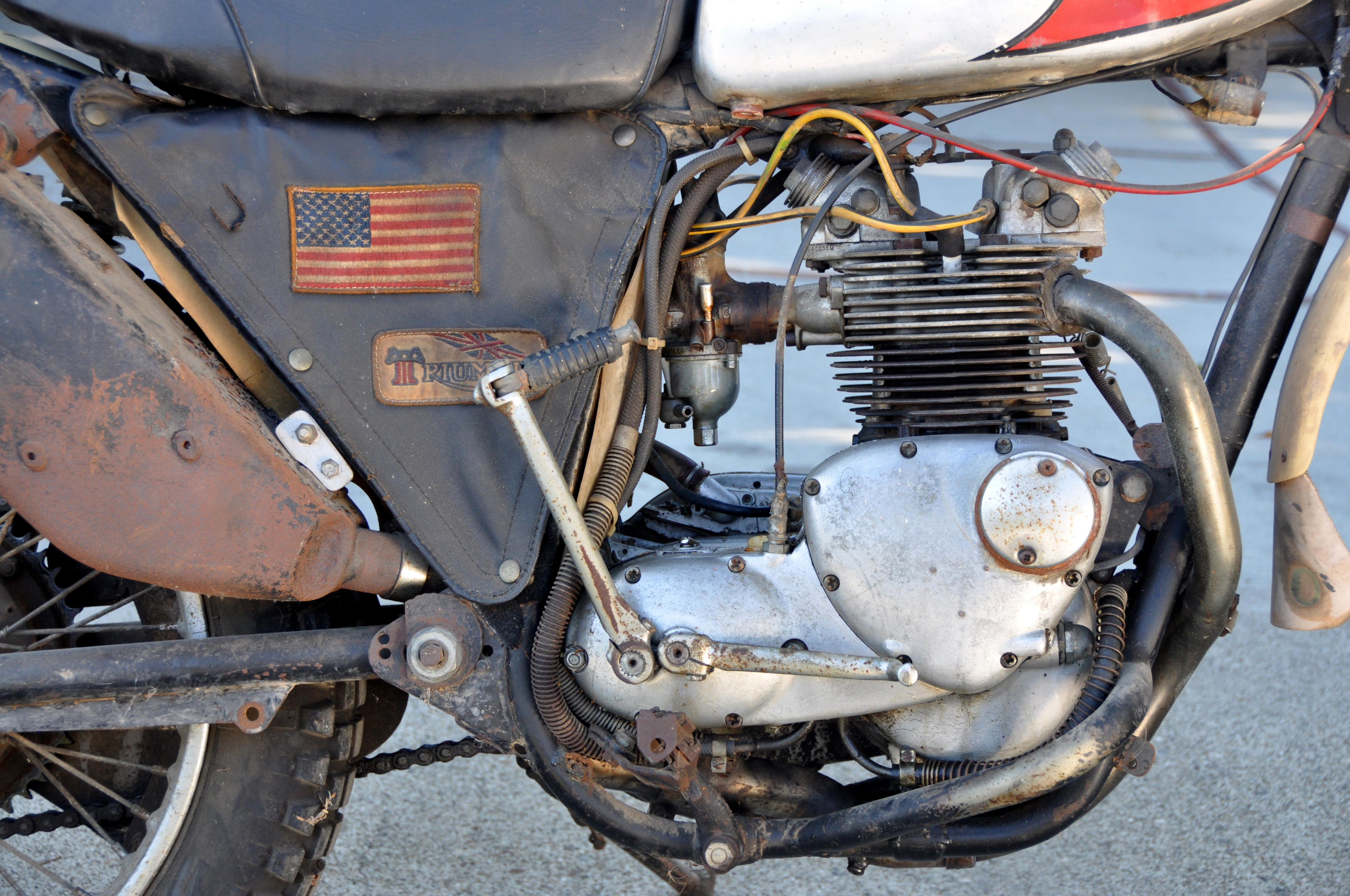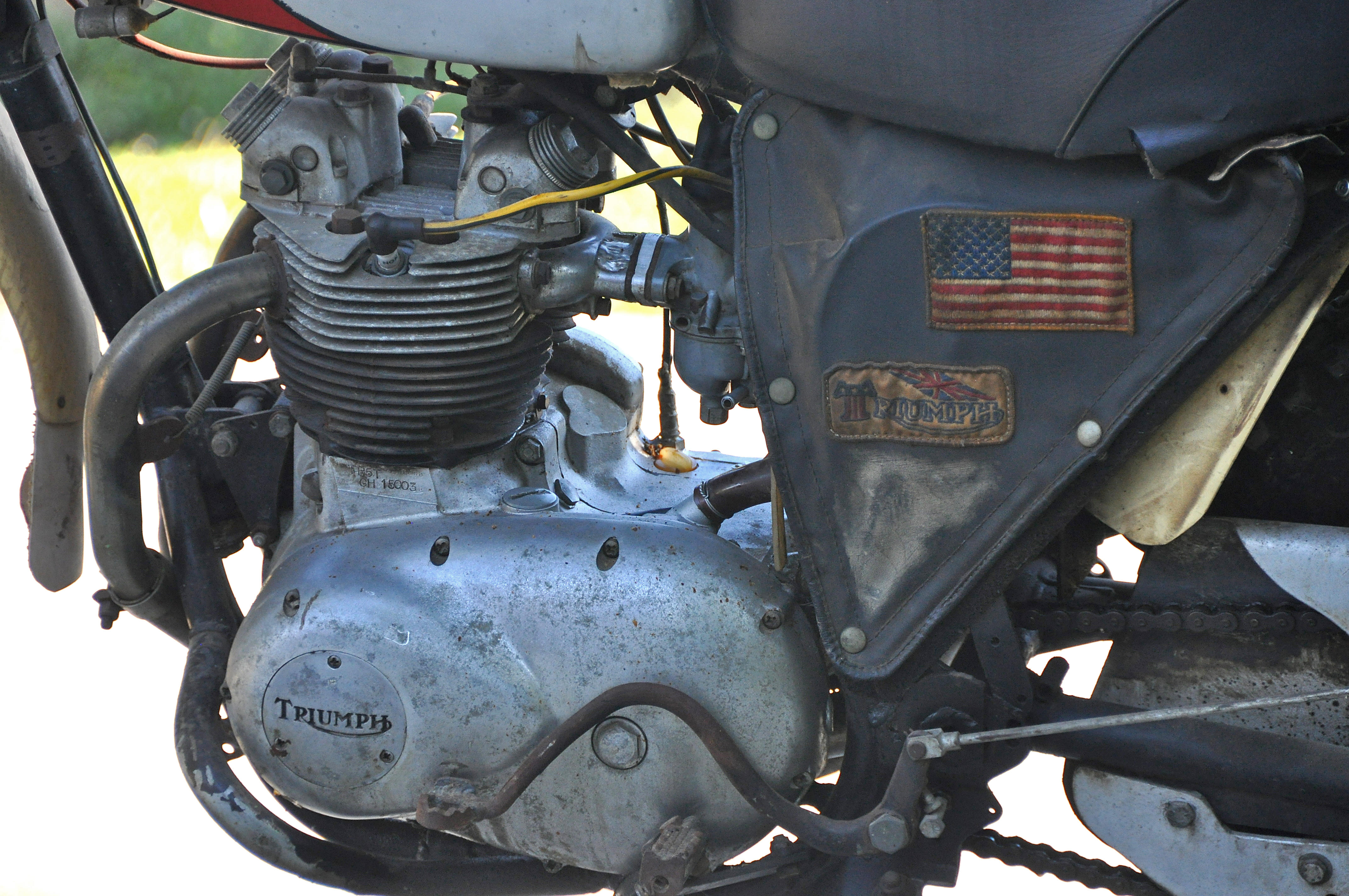 Henry Manney III was no ordinary journalist, so it follows that his trailbike was no ordinary mount. Based on a stock Triumph TR5T, it is in fact one of three factory-backed U.S. team bikes specially prepared for the 1973 International Six Days Trial–the so-called Olympics of motorcycling–held that year in New England’s Berkshire Mountains.Deviations from standard were intended to reinforce the bike’s reliability and included a doubled-up ignition system. Many of the redundant electrics, as well as the air cleaner, were protected from water by triangular naugahyde covers snapped and velcroed beneath the seat. Extra bars welded onto the lower frame rails guarded against rock damage to the engine cases. Aftermarket plastic fenders were more durable than the stock metal mudguards; likewise the cobby twin-lamp taillight assembly was less prone to being cleaned off by low-hanging branches. Rear hub was a BSA B40 quick-change unit, while the small conical front hub was from a Rickman 125. Other ISDT touches included spokes safety-wired at cross points and tommybars welded to the axles to facilitate speedy wheel removal.Records are sketchy but it appears likely this is the bike ridden by American team member Ken Harvey, listed as retired after a crash. Post-ISDT, the Triumph was sold to Manney who rode it on at least two Cycle World Treks, big industry rides in Baja put on by the magazine, judging by the decals still on the front fender. He also used it to make rounds at Saddleback Park, the off-road riding area co-founded by CW‘s Joe Parkhurst. Son Henry IV remembers topping Saddleback’s fearsome Matterhorn hillclimb on the Triumph.Last registered in 1982, this is a time-capsule Triumph, ridden in the Six Days and owned by one of moto-journalism’s great characters. Offered on a Bill of Sale.