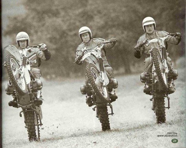 Photo of BMW team riders displaying the agility of the big Airhead Beemer