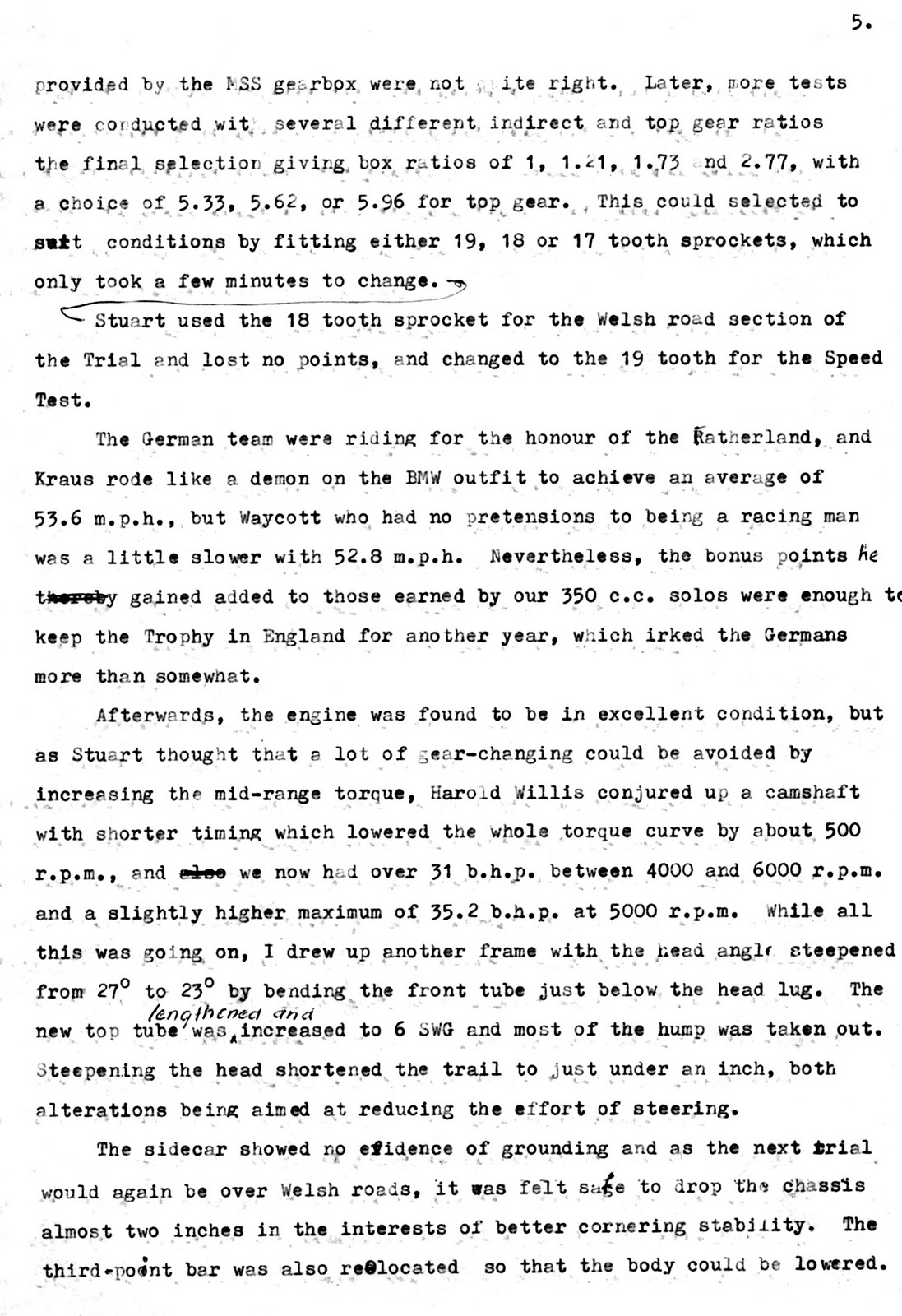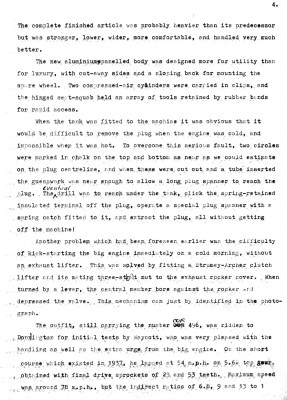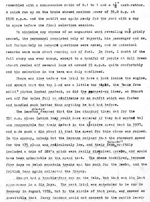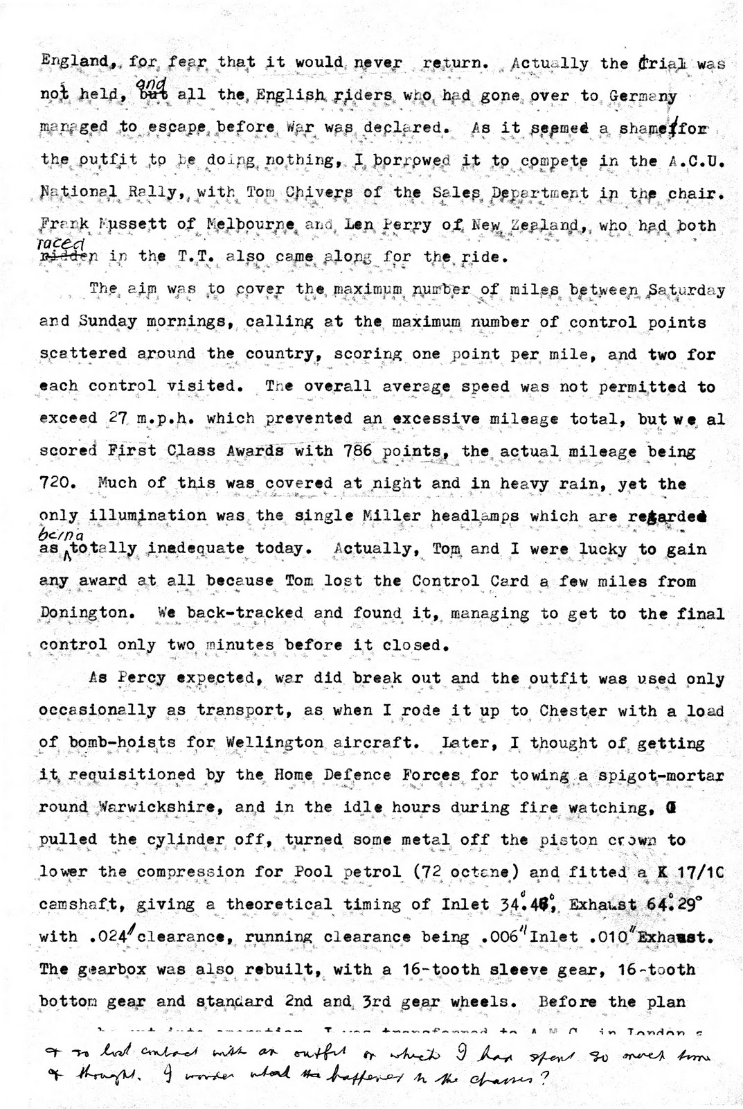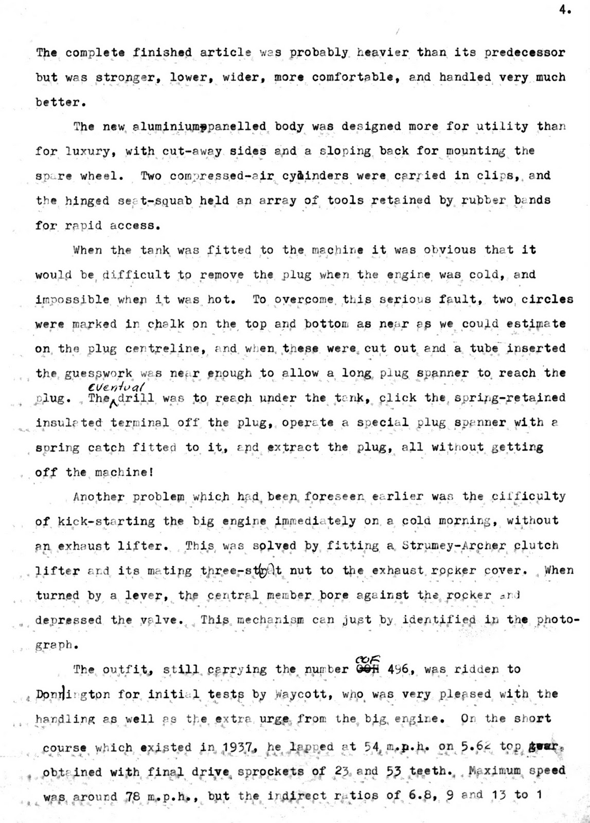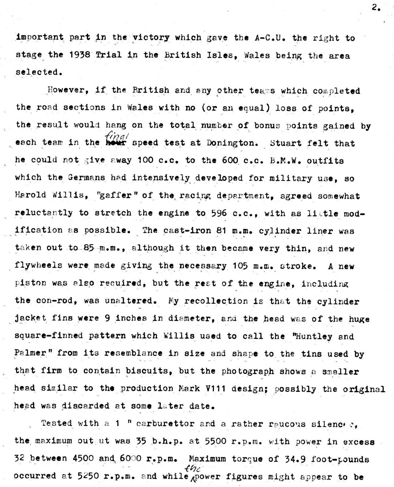 Search as I may that copy of “Motorcycling” seems to have disappeared from my library…….but for 1937 and 1938 he certainlyused a 500cc OHC TT engine that was altered to 595cc with a bore of 85mm and stroke of 105mm.
