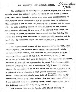 Stuart had a house full of awards, cups, photos etc.  Sadly all were lost when he died.  He did give me 2 press photos taken outside their Bristol Premises.  One was the ISDT Team, 2 Velos but Stuart is riding a matchless!  Ivan Rhodes dates the photo as 1934/5.  The other photo shows Stuart on a Rudge outfit.  I believe one of his passengers was called Rowley but have no more info.  Maybe some of the members can help out Stuarts Velo outfit had special QD wheels and a hole in the petrol tank for easy S plug changing.  Tools clipped on the side somewhere.”