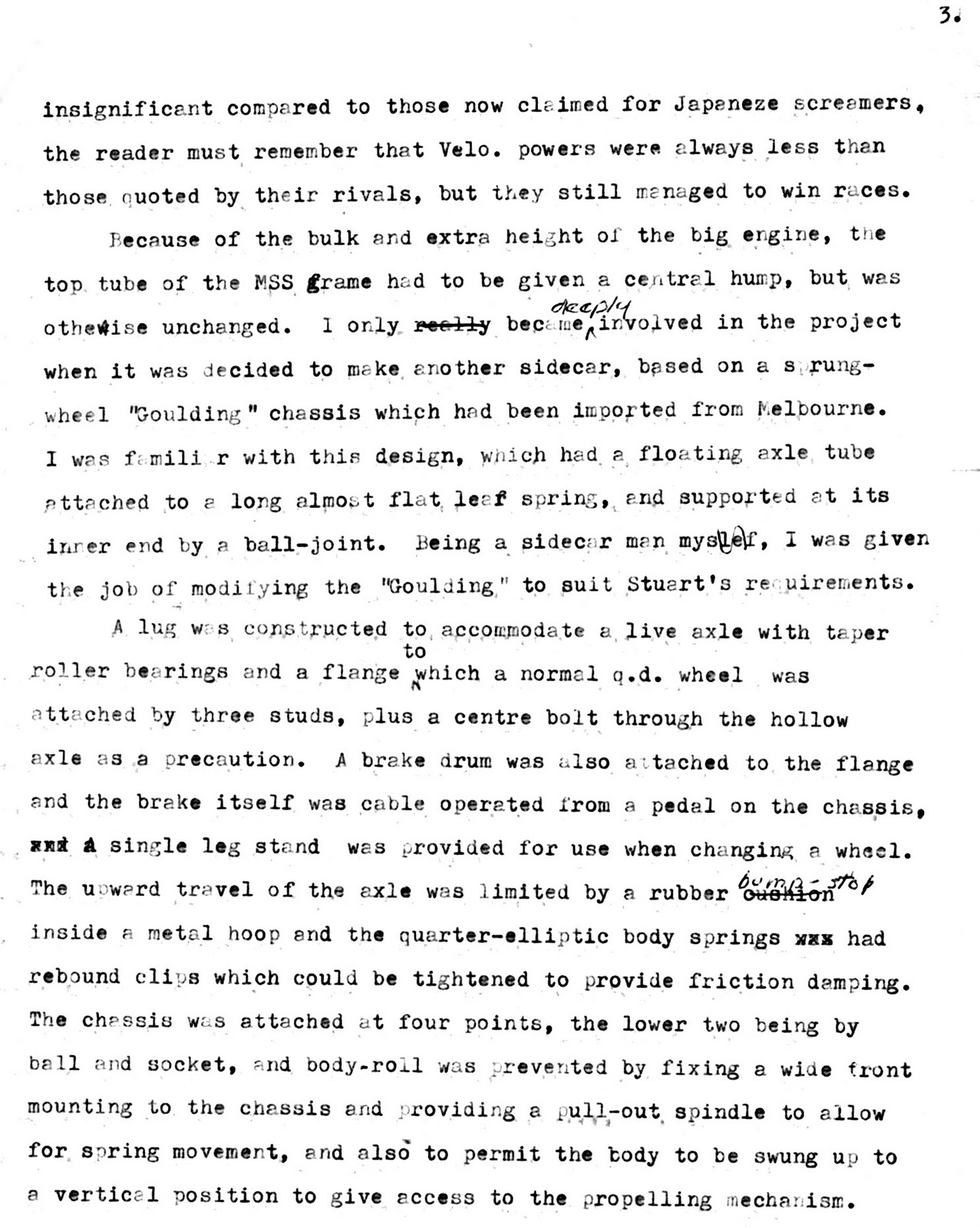 For 1938, the period we are going to look at, the outfit was a modified Goulding sidecar that Phil Irving comments was at Veloce at the time.