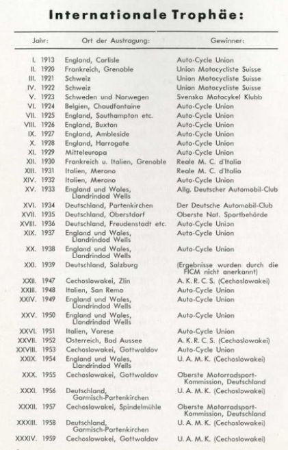 Image of scanned list of International Trophy Winners 1913-59 from programme ISDT 1960