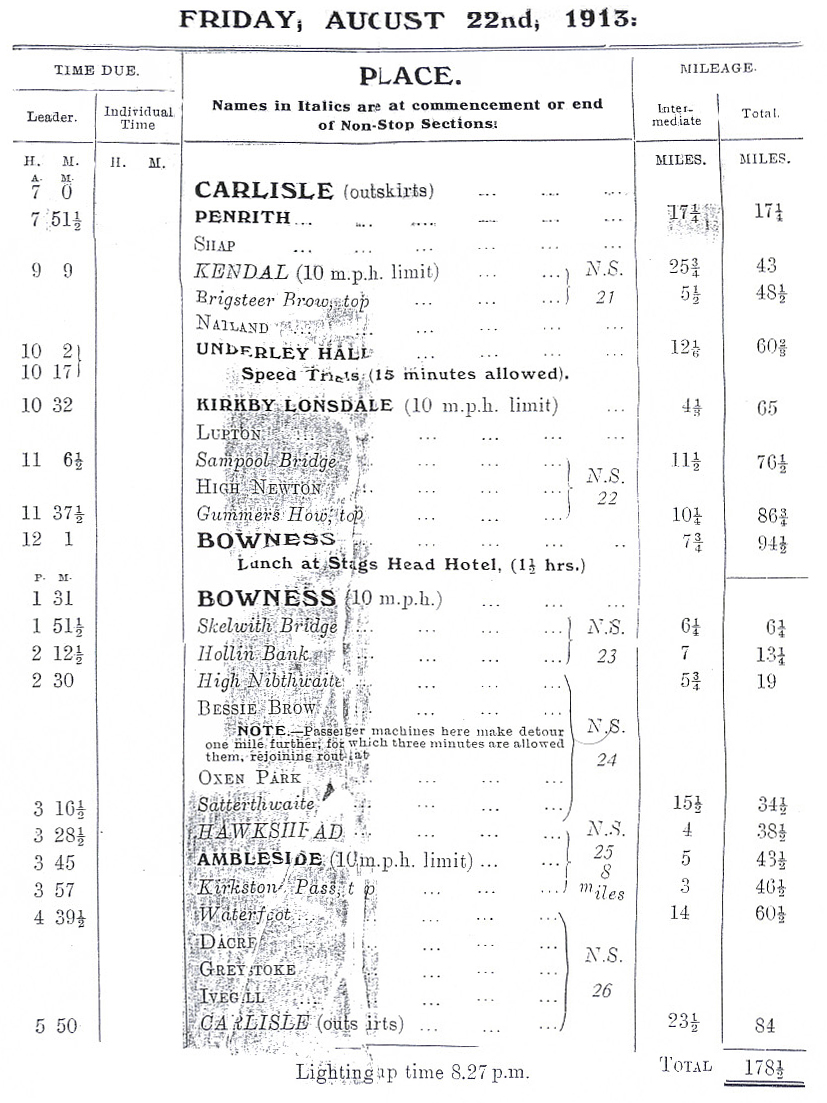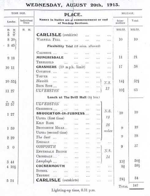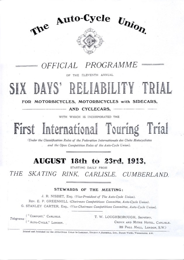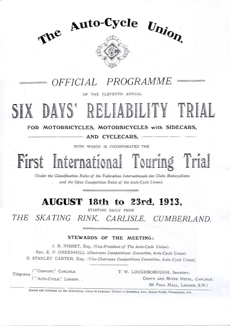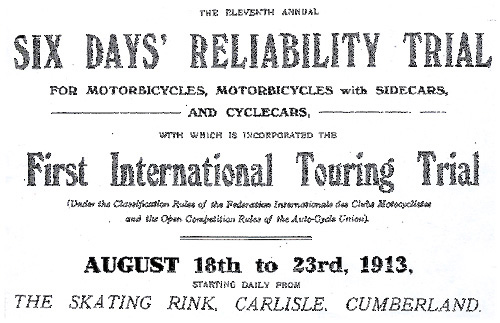 The 11th Touring Reliability Trial incorporated the First International Six Day Trial which took place at the Skating Rink, Carlisle, Cumberland ( now Cumbria) August 18th to 23rd 1913