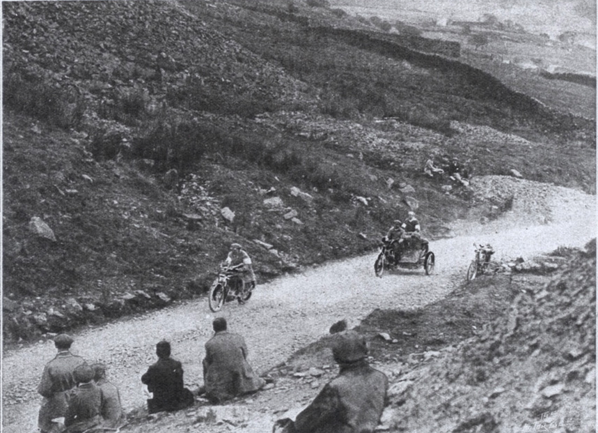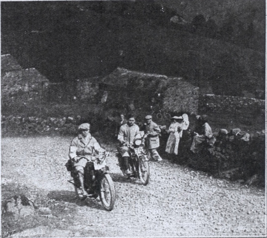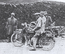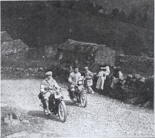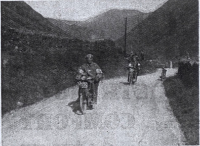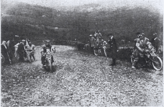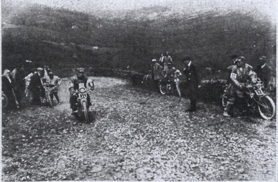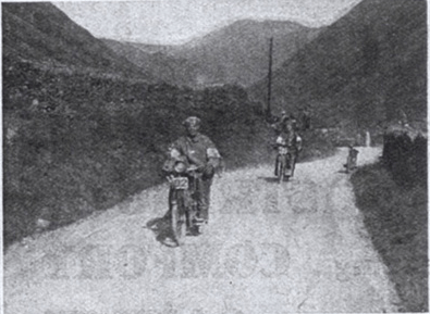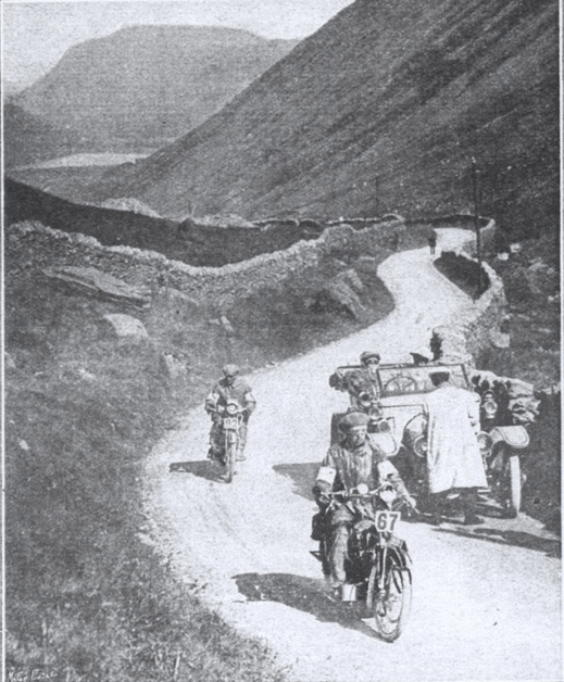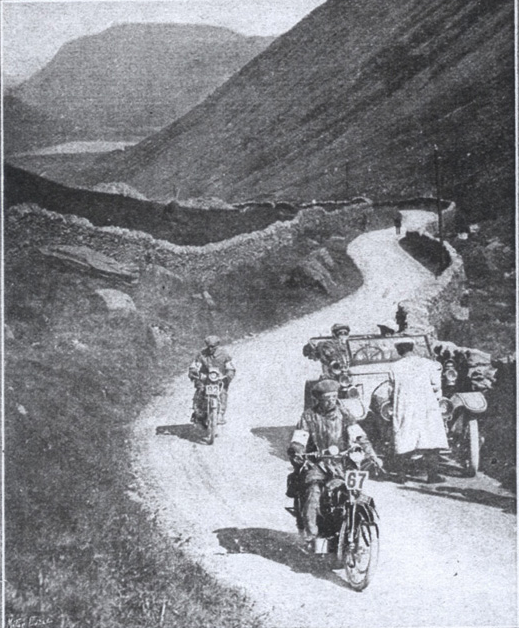 Photo of day 5 at Kirkstone Pass with#32 H.V.Colver on Enfield #106 B.A.Hill on Indian #38 G.E.Cuffe on Premier in ISDT 1913