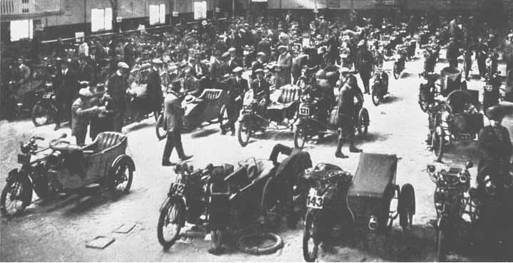 Photo of the scrutineering of bikes and sealing of machines at the Skating Rink in Carlisle ISDT 1913
