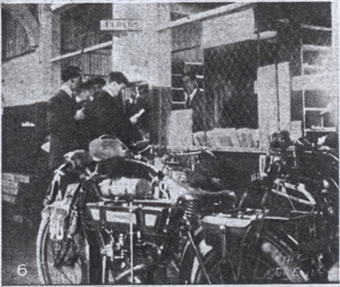 Photo of a weighbridge scene with bikes #6 #21 #37 #53 #130 from the first ISDT 1913 (Copies of this image can be purchased from http://www.mortonsarchive.com)