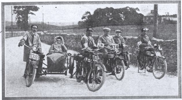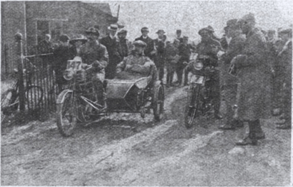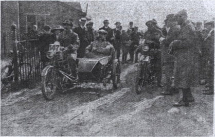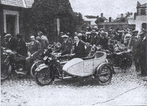 Photo of riders waiting outside of a control at Penrith on 2nd day #138 W H Eggington – Enfield Sidecar #65 D M Bro – Rover #74 ISDT 1913