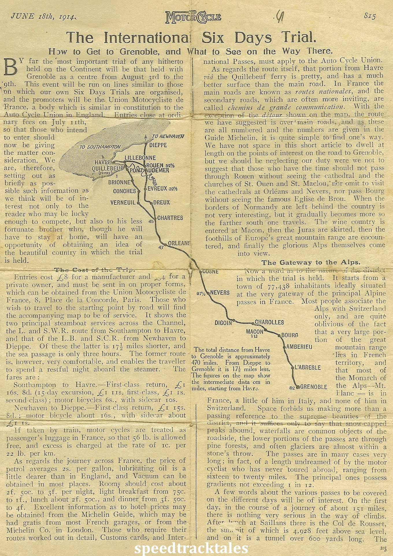 In the June 18th 1914 issue of ‘the Motor Cycle’ an article on the event the procedures to enter, the route to reach Grenoble and the costs associated wit htravel across Europe are provided to help any riders contemplating the crossing of the English Channel to take part in the second International Six Days’ Trial.
