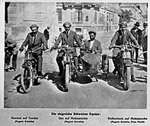 Langmann(Lengman) auf Scott, der sich in der Strecke geirrt hatte, indem er kurz nach Chancy die volle Geschwindigkeit fuhr und den eigentlichen Kilometer nur mit 54 km/h absolvierte, erhielt für diesen Irrtum 31 Strafpunkte. Eine diesbezügliche Reklamation war ohne Erfolg. Der erste Platz in der Markenkonkurrenz mußte somit an Motosacoche abgegeben werden. Vom Kilometer lance fuhren die Konkurrenten direkt ins Batiment Electoral, wo eine gewaltige Menschenmenge die tapferen Fahrer begrüßte.
