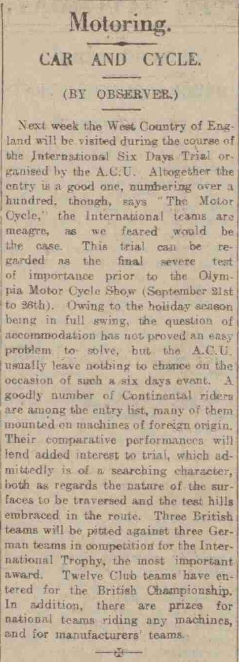 image of scanned newspaper article Devon & Exeter Gazette on forthcoming ISDT in the South West of England and ACU Wessex Centre, 15 August 1935 ISDT 1925