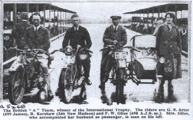 photo the British ‘A’ Team winner of the International Trophy. The riders are G S Arter (499 James), B Kershaw (346 New Hudson) and FW Giles (496 AJS sc) Mrs Giles who accompanied her husband as passenger is seen on the left. ISDT 1925