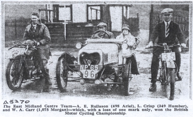 Photo of the East Midlands Centre Team – AE Rollason (498 Ariel), L Crisp (349 Humber) and WA Carr (1075 Morgan) – which, with the loss of one mark only, won the British Motor Cycling Championship ISDT 1925