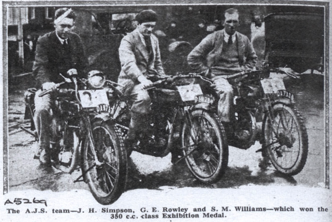photo of the AJS team #31 JH Simpson, #29 GE Rowley and #30 SM Williams – that won the 350cc class Exhibition Medal ISDT 1925