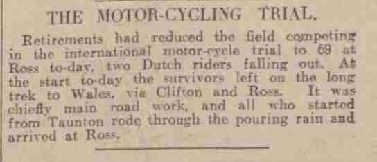 image of scanned newspaper article Nottingham Evening Post with brief report on day 2 at Ross on Wye 19 August 1925 ISDT 1925