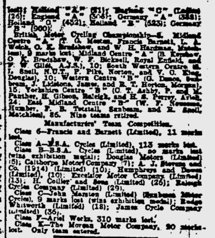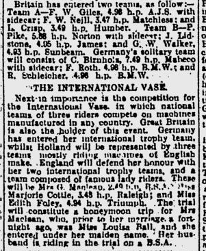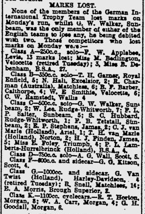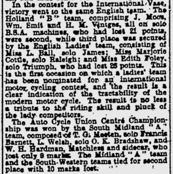 The three teams of B.S.A. riders consisting of a ladies team, the gents’ B team and a team of Dutch riders all scored notable successes ; the B team being the only team in the trial to finish without loss of points. The ladies’ team secured a team’s prize trophy, and the Dutch team finished second for the international silver vase In addition to these awards the 12 B.S.A, entrants secured ten gold and one silver medals.