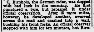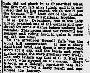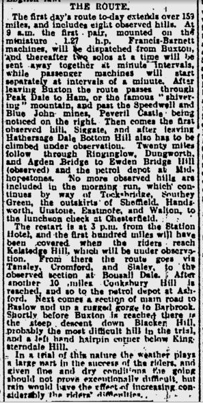 On Blacker Mill Hill for instance, which competitors had to descend on the first day and ascend on the second day — very few of the riders managed the descent without falling off or losing control of their machines, so steep was the declivity. Again, only 25 per cent of the entrants climbed this hill the following day, the remainder falling half way up.