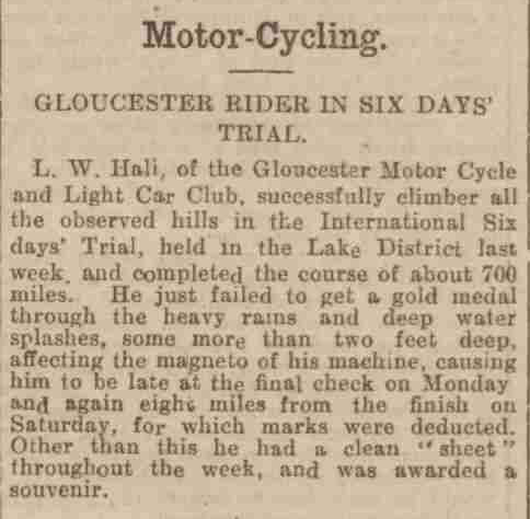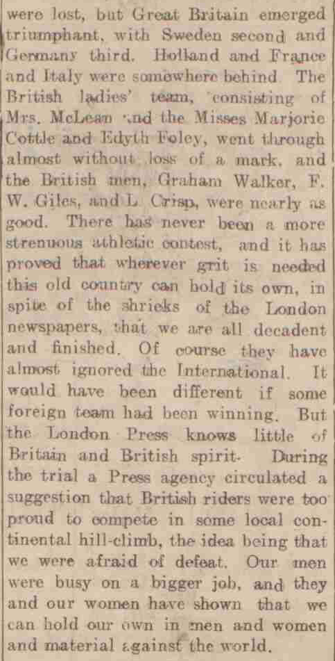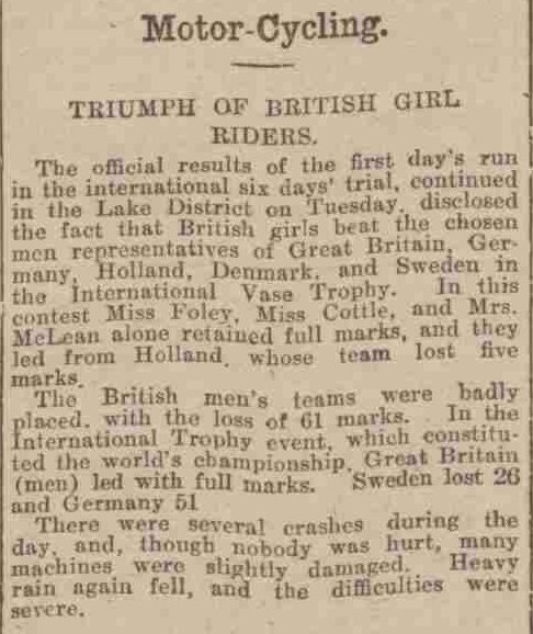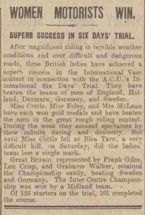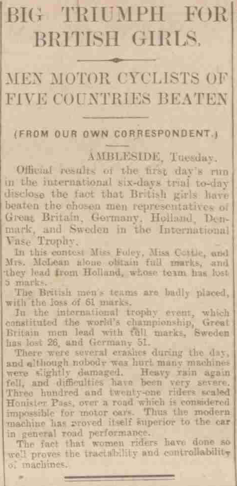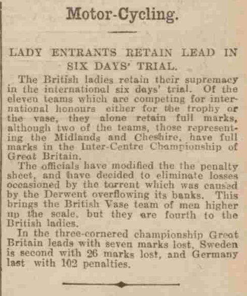 Image of scanned article in Western Morning News 17th August 1927 reporting the exceptional performance of the women riders ISDT 1927