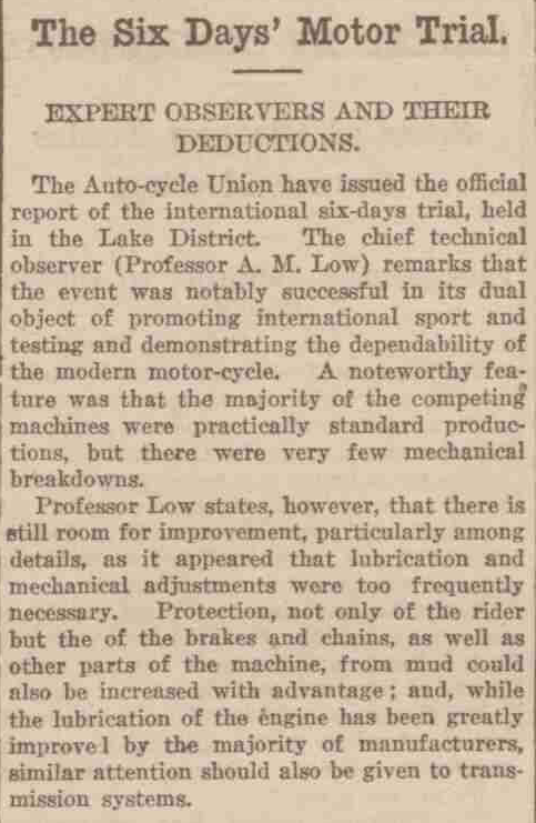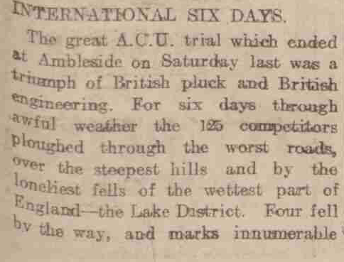 The International Six Days’ Trial has attracted an entry of over 100 competitors. It Is to be regretted that France, Belgium, Italy and Switzerland will, not be officially represented, as a six days’ trial with seven or eight nations competing would be an unusually interesting and informative event. It Is understood that the present unfavourable rate of exchange is accountable for the absence of European competitors.”