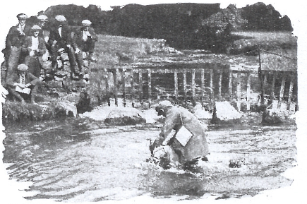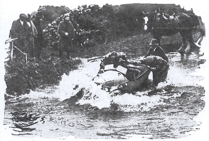 Image of #44 G E Rowley (AJS) through a number of drowned bikes including #27 #39 Marjorie Cottle and #42 #25 with wet magnetos at the Asby Splash ISDT 1927 (image from STT collection)