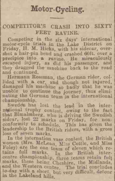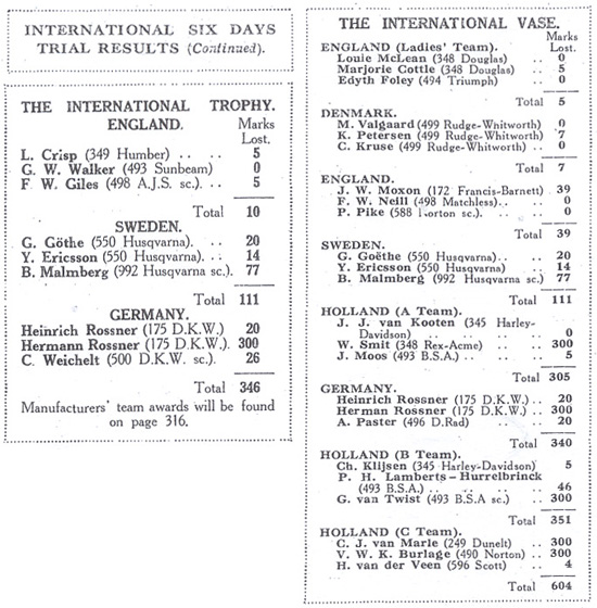 This year the ISDT took place over the 15th to 20th August in the English Lake District attracting a lot of competitors. Based at Ambleside it ended with L Crisp, G W Walker, and F W Giles winning the Trophy with Silver Vase almost uniquely being taken by the British Vase Team entirely made up of women racers Marjorie Cottle, Edyth Foley and Louise MacLean.