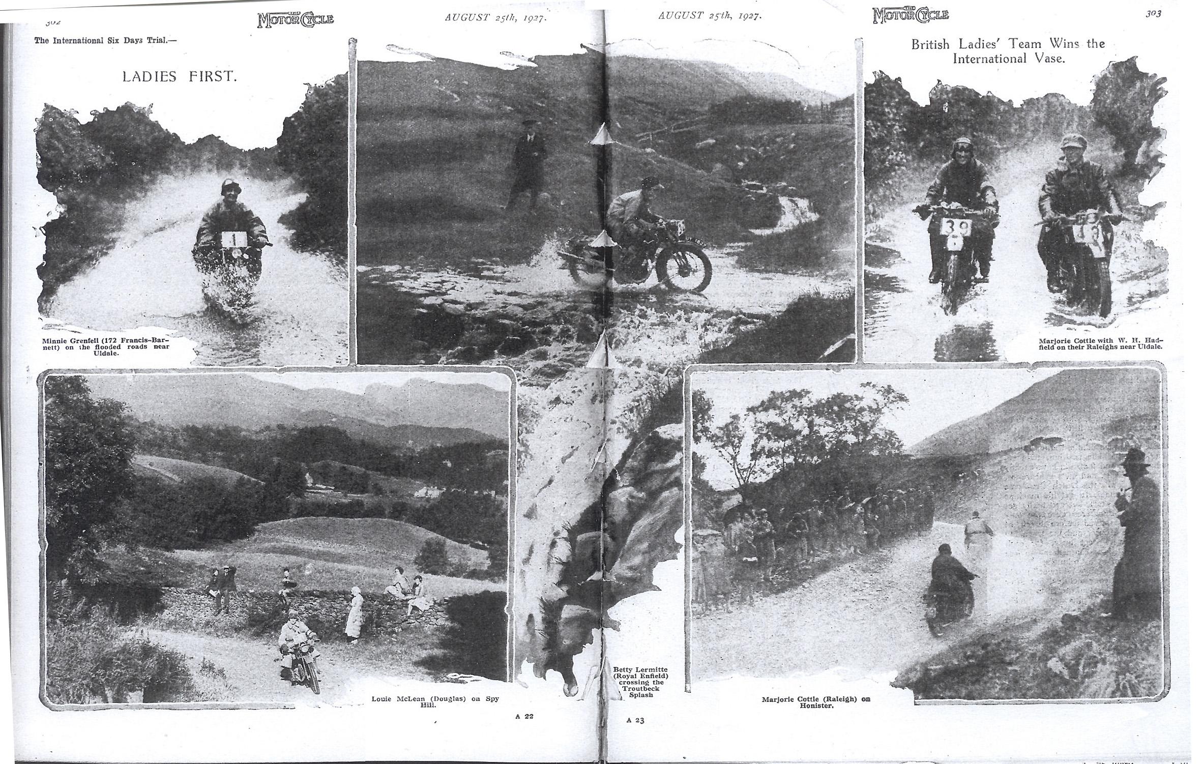 Double page spread features the most successful ladies team in the ISDT ever featuring #1 Minnie Grenfell on her Franny B, #39 Marjorie Cottle, Louise Mclean, and Betty Lermitte,