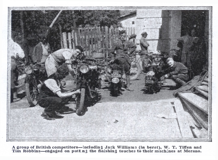 Photo – British Competitors including Jack Williams, WT Tiffen and Tim Robbins preparing machines at Merano ISDT 1931 (Image Morton’s Archive)