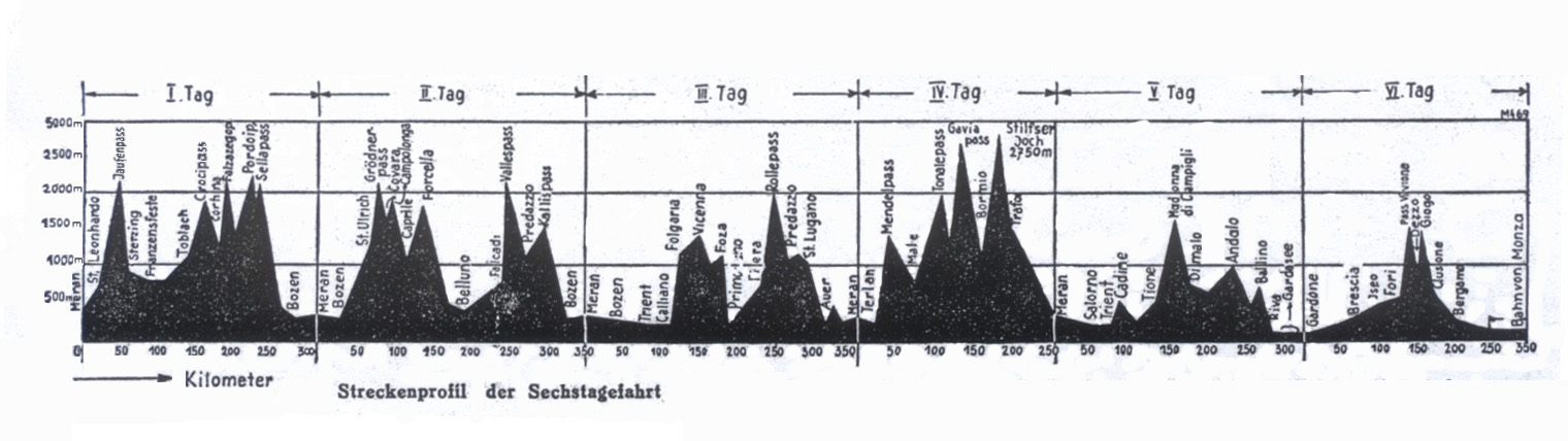 The course was considered quite hard with many injuries occurring. The route took riders over the Stelvio Pass at 9,042ft