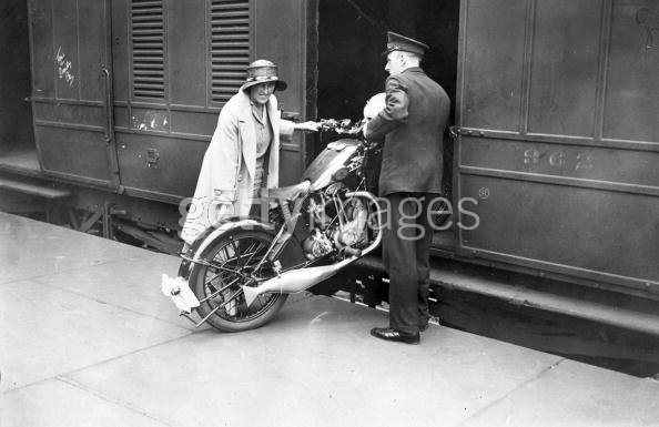 Photo: 25th August 1931: Motorcyclist Marjorie Cottle and a porter load her motor-cycle into a goods wagon at King’s Cross Station, London, bound for Merano, Italy, to compete in an International Six Days Trial. (Photo by J. A. Hampton/Topical Press Agency/Getty Images) ISDT 1931