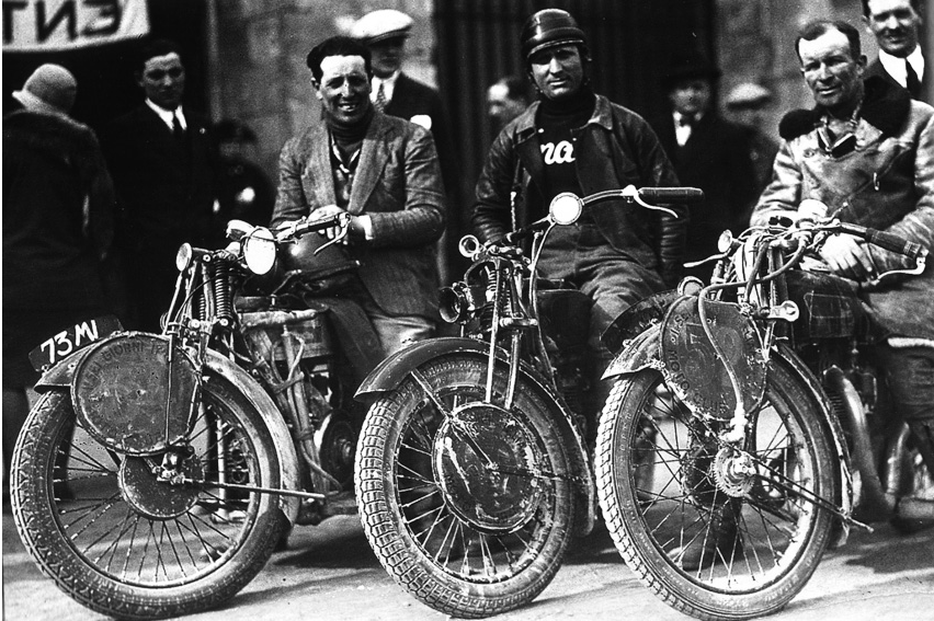 Photo of the winning Italian Trophy Team l-r #19 Luigi Gilera 600cc Gilera sc, Miro Maffels 500cc Gilera, and Rosolino Grana 500cc Gilera ISDT 1931 (image Morton’s Archive)