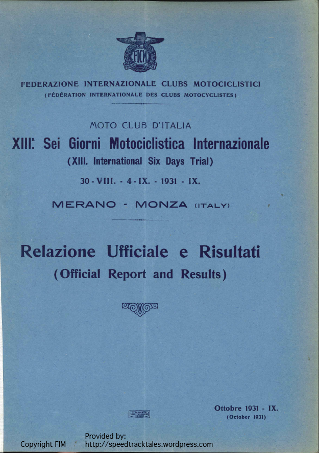 The 13th International Six Days Trial took place in Merano, Monza, Italy in 1931 over the 30th August to 4th September with nearly 100 starters.